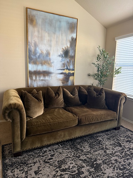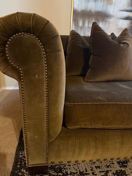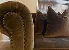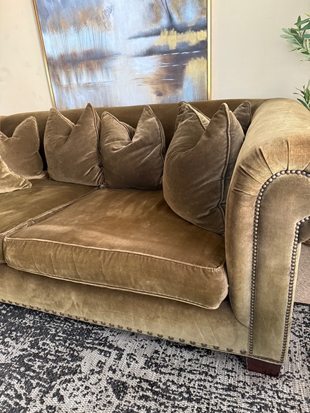 Restoration Hardware nailhead sofa in a gorgeous olive green color. Minimal wear and tears. Down feather cushions & back pillows.