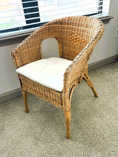 Classic IKEA Rattan Chair with off-white chushion included. Both in excellent shape. You can purchase an identical chair from the store for $100 (extra for cushion) or for 60% less here for one only slightly used. 30"T x 22"W