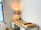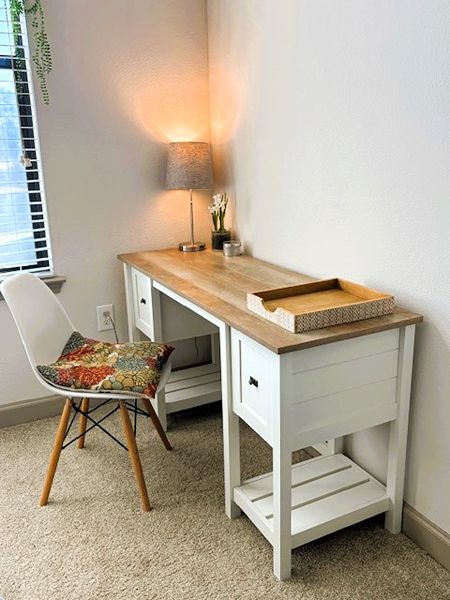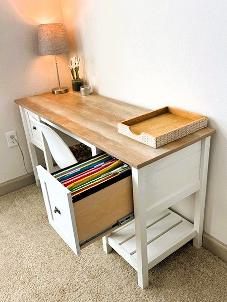 A charming rustic styled white wood desk with that has a contemporary hanging-file drawer.  Comes with lamp, hanging files, paper tray and chair.  All in extremely good condition.  54L x 19.5W x 29T"