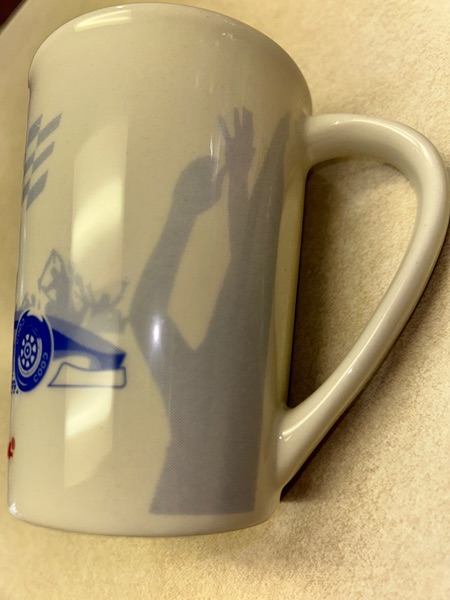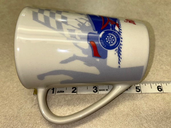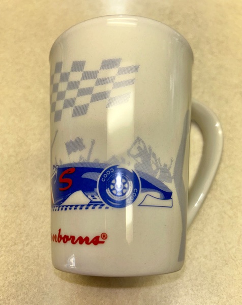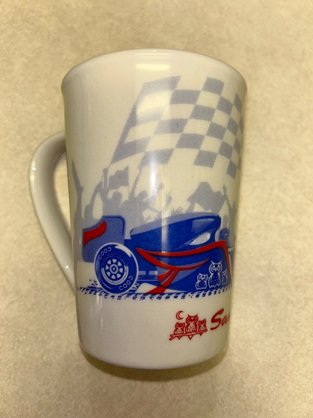 This is a souvenir mug from Sanborns in Mexico. It has a beige background, features a race car in blue and red, a checkered flag and cheering crowd in gray, and the Sanborns name and owl logo in red. It stands about 5 inches tall. In new condition, never used, smoke free home. $5