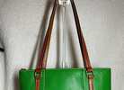 Beautiful green pebbled leather tote in like-new condition. The leather is vibrant and clean with no stains, scuffs, or cracks. Brown leather handles and trim are in excellent shape with minimal to no signs of wear. Hardware is shiny and intact. Interior is clean and well-kept. Gently used, if at all—looks nearly new and ready to carry.