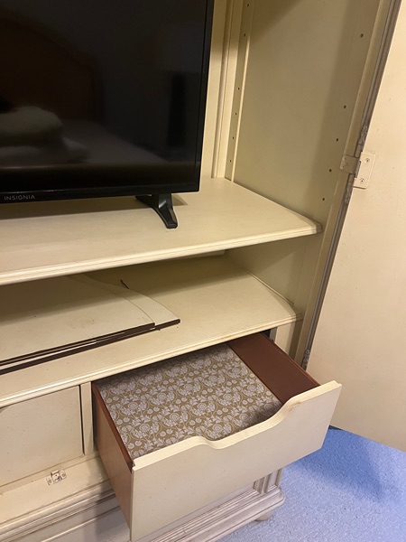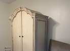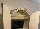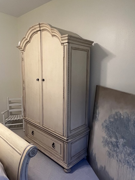 Beautiful country French Queen Size cream color sleigh bed and armoire. Bed has upholstered headboard and armoire has pole to hang and shelves. Excellent condition, has been in guest bedroom. Would be great for master, girls bedroom or guest bedroom. Also used armoire in master bathroom for linens. Great pieces. Just need room for baby.