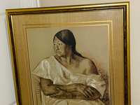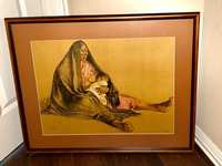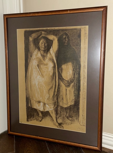 Francisco Zúñiga (Mexican, 1912–1998)'s Umbral signed and numbered print 14/75 with frame (26" x 31"). Zúñiga was a Costa Rica-born Mexican best known for his stylized figurative paintings and sculptures. His works are in permanent collections at the Metropolitan Museum of Art in New York, Museo de Arte Moderno in Mexico City and sculpture garden in Washington, D.C.