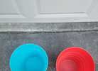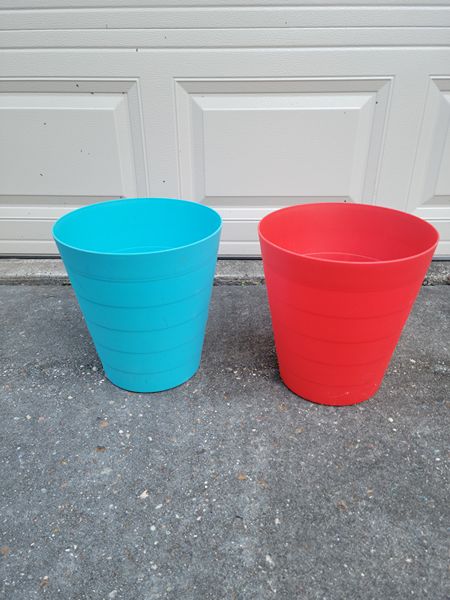 Pair of red and blue plastic trash cans