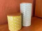 Green and blue geometric patterned ceramic canisters with bamboo lids