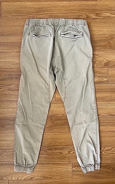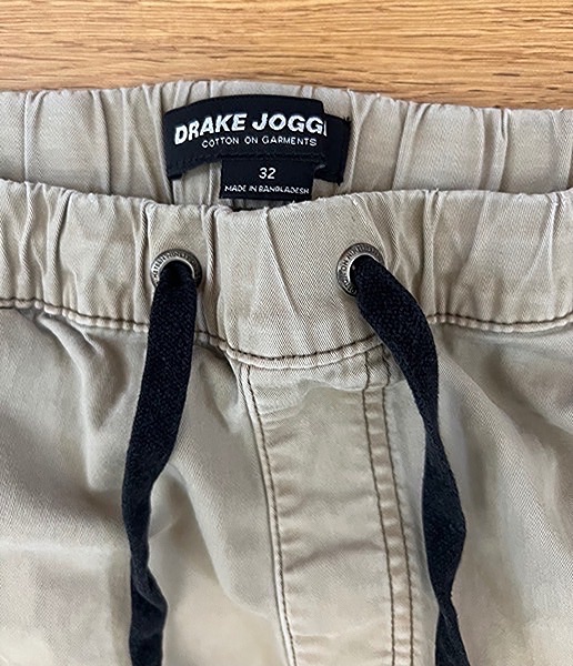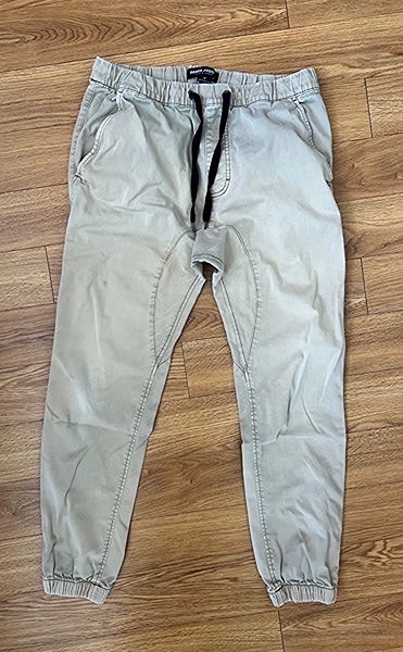 Light beige joggers, size 32, with drawstring waist and elastic cuffs.