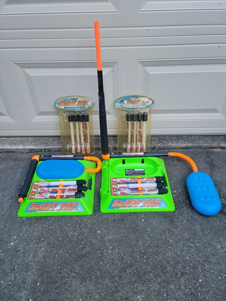 Clearing out old toys from the garage, these are fun to launch at the park or field (away from trees) and try to catch as they come down. Just extend the black and orange tune, point it away from people and push a rocket onto the orange tip and stomp on the blue plastic bulb.