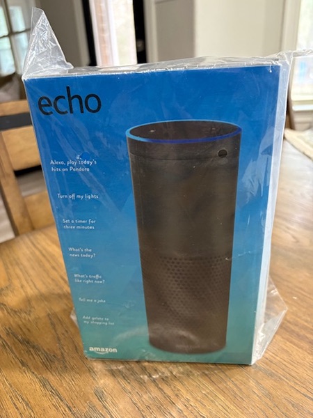 Amazon Echo smart speaker, brand new, unused, still in original factory packaging.