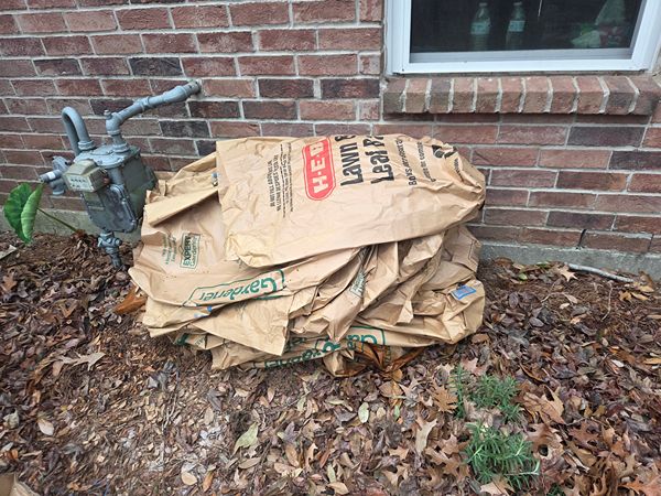 38 paper law and leaf bags for yard waste. Been used once and in good shape. You don't need to take all of them--just what you need. They are on the side of my home so you can pick them up on your own.