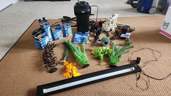 Fluval 207 external filter, water heater, UV filter, plants, led light, and decorations from a 30 gallon tank. Most are less than 5 years old, also includes remaining fluval filter media.