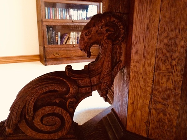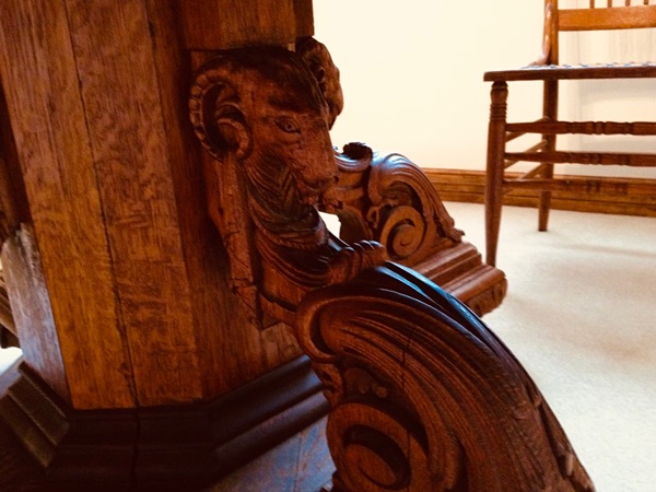 Antique table originally from England. Purchased at an antique auction in Leavenworth, Kansas in 1975. Base has 4 carved rams heads. 40 inches tall. Diameter is 54 inches. Made of oak. Asking $300.00.