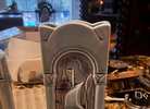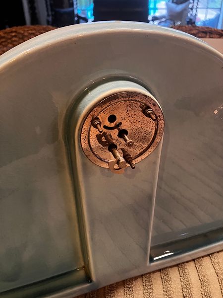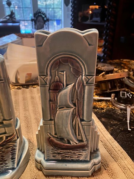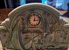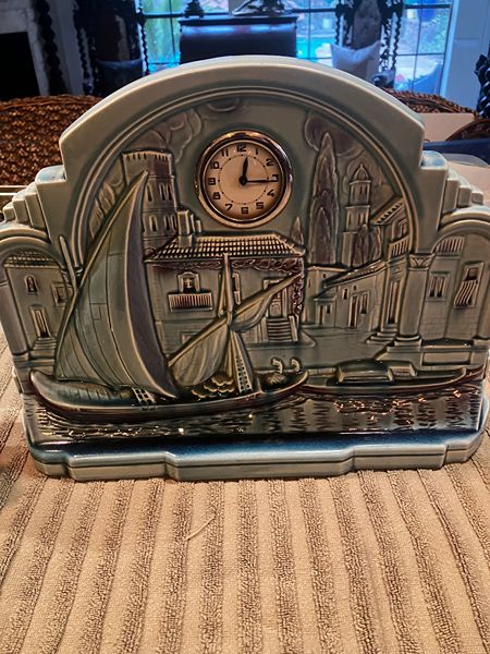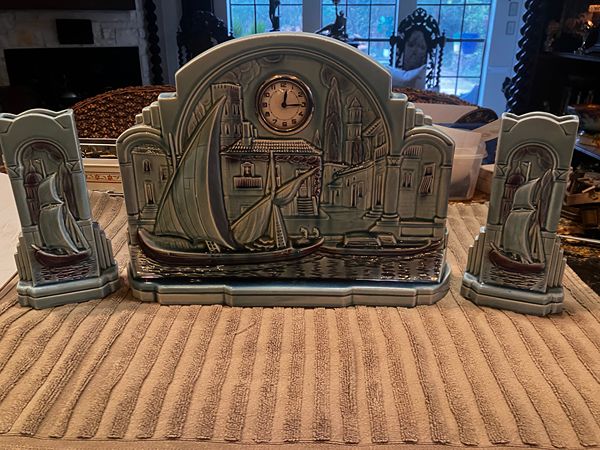 Beautiful vintage Majolica Sarreguemines clock set, depicting a European port scene with sail boats and schooners. The set is in perfect condition and is running great. Clock is 14 1/2" W and 11" T, garnitures are 8 1/2"T and 4"W.