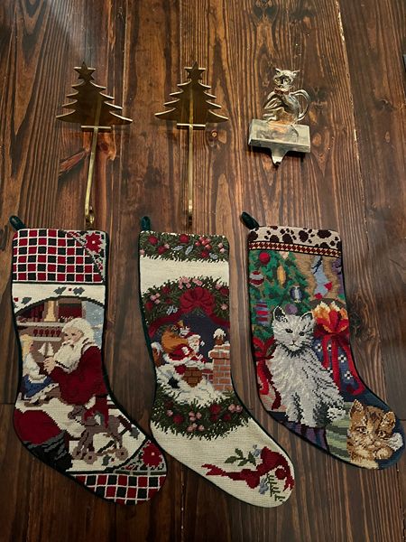 Set of three wool vintage needlepoint Christmas stockings with three brass holders. Back of stockings are green velvet. Excellent condition. Smoke free home.