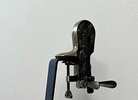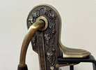 • The opener is made from cast iron or aluminum components with a brass or bronze finish, while the stand has a dark wood base. ?