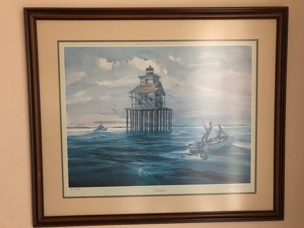 Noted artist, Sam Caldwell, depicts an oil rig in the Timbalier Bay off the coast of Louisiana. Lithograph is numbered and signed. 37/100. Nicely framed. Asking $175.00.