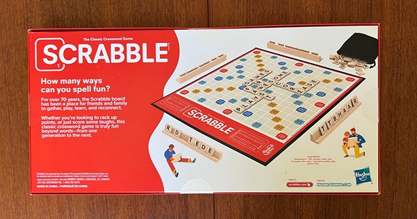Includes gameboard, 100 wooden letter tiles, 4 wooden tile racks, drawstring letter bag, and game rules.