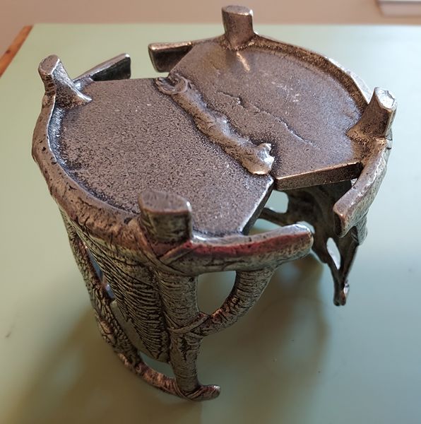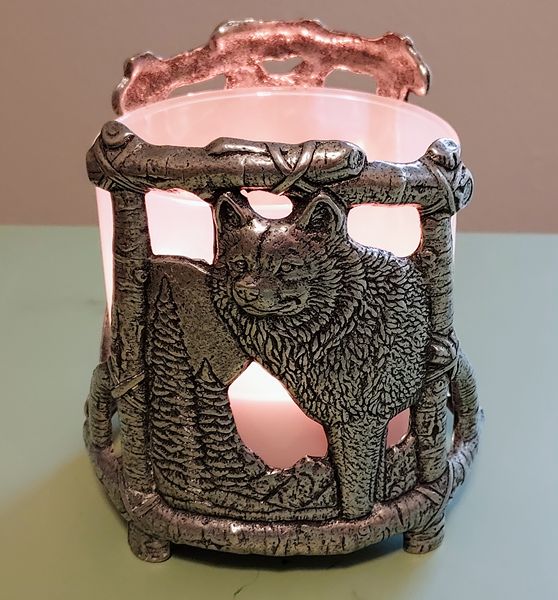 Hand-forged, artisan 3" candleholder features a rustic scene of a wolf in the wilderness. Comfortably holds Bath & Body Works 3-wick candles or similar. It has the same image on both sides and show's the artist's soldering marks where the pieces are joined. The candleholder is in excellent condition. Priced at $25 - cash only. If interested text or call 281-825-9606. Thank you.