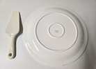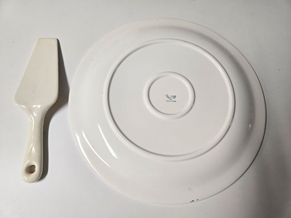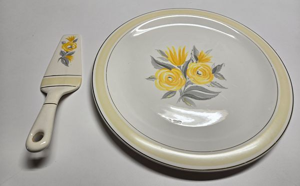 This ceramic cake plate and matching server features a yellow flower border around the cake plate and server. It is in excellent condition with no cracks, chips or crazing. It is stamped on the back, "USA 941". Also stamped but can't make out the full name..."Cac--sville China Co." Price is $25 - cash only. If interested text or call 281-825-9606. Thank you.
