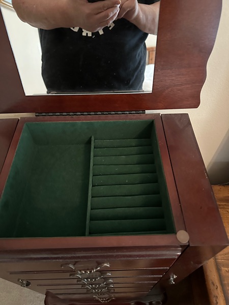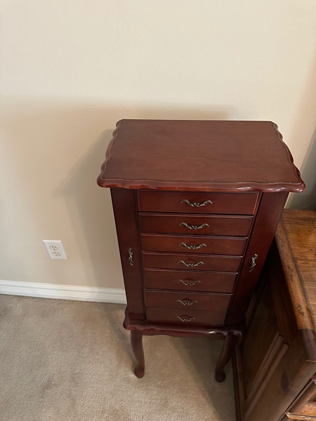 Cherry Jewelry Cabinet, 15 ¾”x10 ½”x40”Tall, w/ (5) Drawers and (2) Doors and Hinged