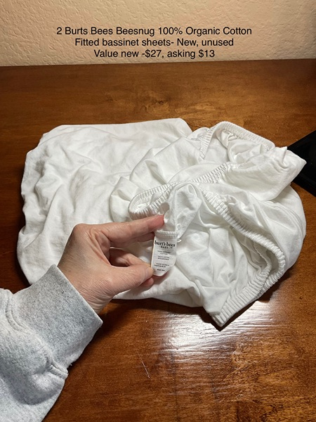Two Burts Bees 100% Organic Cotton Beesnug Bassinet Fitted Sheets, white - Brand new, unused but washed once in non-toxic laundry detergent. Value new $27, asking $13.