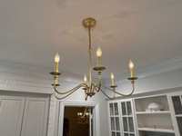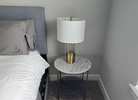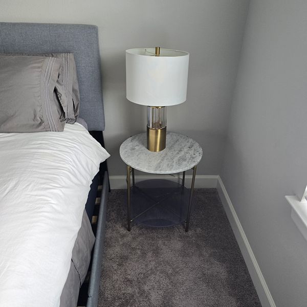 Gold and glass modern table lamp with white shade. Located in The Woodlands 77381. Crossroad kuykendahl road and research forest drive.