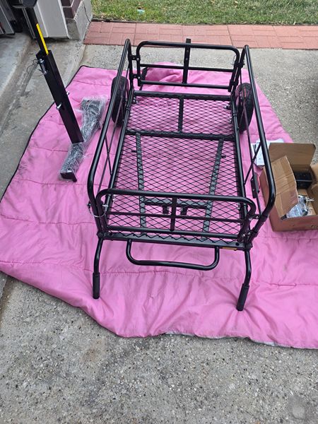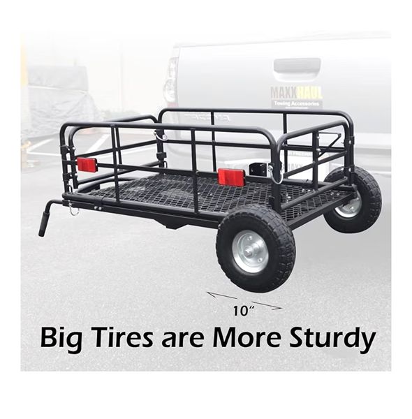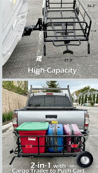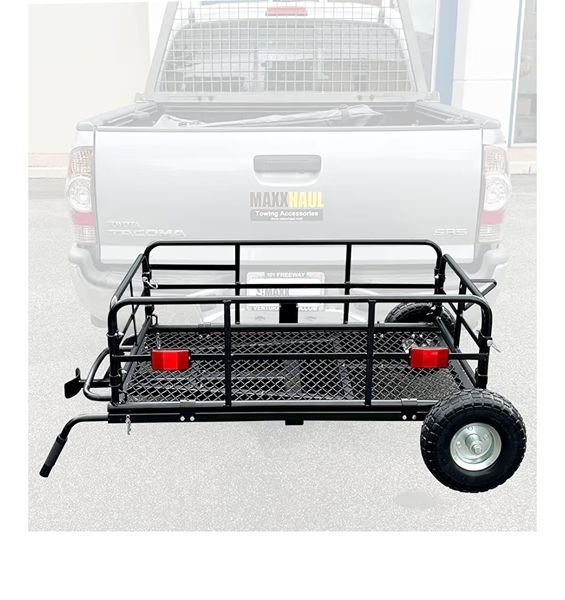 Brand new never used MaxxHaul Model 50243 Foldable Hitch N Roll Cargo Carrier Cart With Quick Detachable Basket Rack With 10 inch Flat Free Tires for Home Camp Travel Ranch SUV Up to 400 lb. Capacity. See pictures for dims. Price is firm.