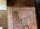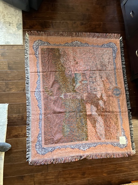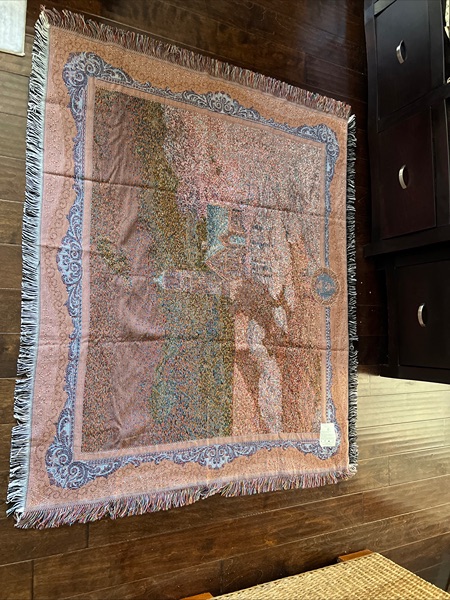 2003 Thomas Kinkade “Painter Of Light” Afghan Tapestry Throw Blanket. New, never used, still has the sticker on the back. No sales tag. No box. 5’ x 4’ rectangle. This is a lovely tapestry, highlighting, a beautiful lighthouse along a rocky shoreline with the waves leaping up towards the sky. Sure birds are flying above the tree and house. It’s a lovely tapestry. Primary color around the outside is a teal blue, dark and light. The Thomas Kinkade signature is at the bottom of the picture. Other colors in this tapestry include gold and white, beige and black, red, orange, green, brown,. I’m sure there’s more but those are the ones I see the most of. The fringe around the outside is black and white at the top and bottom and on either side multicolored. Very unique.