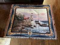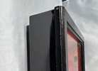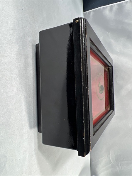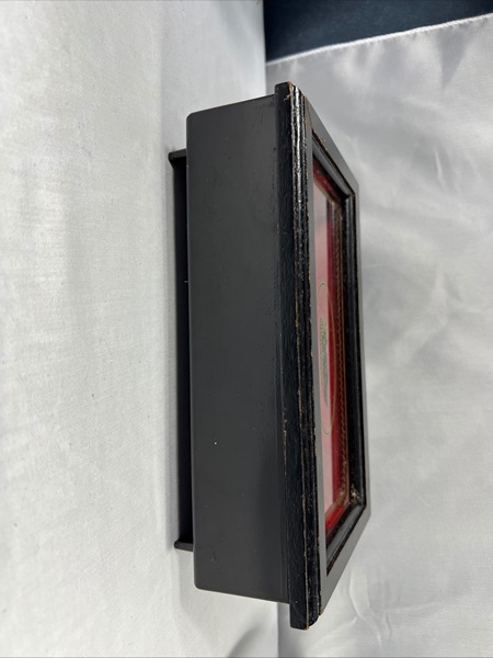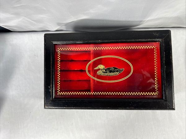 Very nice Vintage Black Laquer And Paint wood and glass mans jewelry box with Red Velvet interior. Held rings and other mans jewelry. Glass is loose so will be secured for shipping. Glass is reverse painted in a gold color checker pattern around the edge and a mallard duck inside of an oval. The box is 8 3/8 inch long by 5 1/8 inches wide by 2 5/8 inches high. There are some areas where the wood is showing through the paint, but not badly. Interior in very good condition.