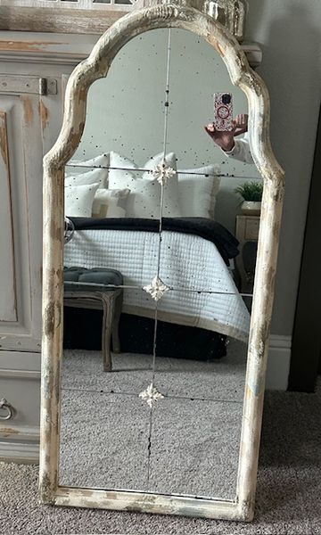 Set of 3 decorative wall mirrors. Mirrors are 21x46 and have 3 mullion-type pieces to give appearance of being paned glass. The frame is distressed ivory/cream wood with antiqued glass. They are not very heavy so should not require special hardware to be hung (We did not have to use it.) Beautiful way to give the illusion of expanding your space!