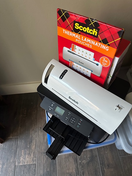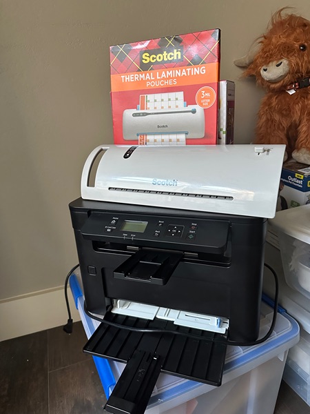 Wireless canon printer that's in almost new condition. We are moving in 6 days and we aren't taking it with us. Bought this to use in our home office 18 months ago just before realizing we were going to move and my husband won't need it since we are moving next to his office and no longer commuting. The laminator was mine to use for tagging but I sold my business and it's fun and nice to have but with our downsizing we won't have any extra space or storage for items like this, and if you look these items up on Amazon then you see it's a great deal.
