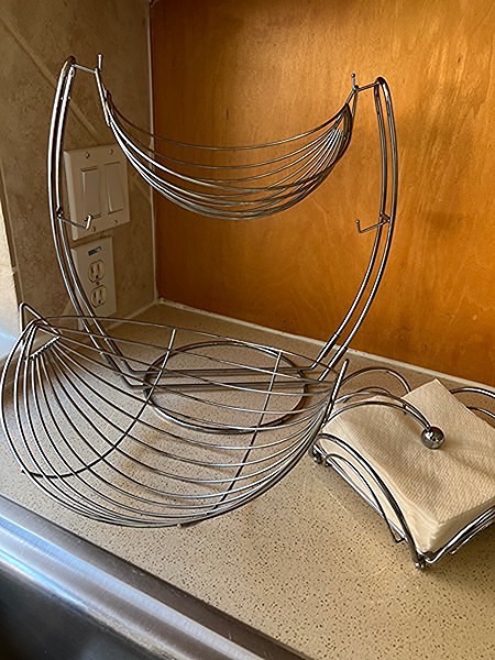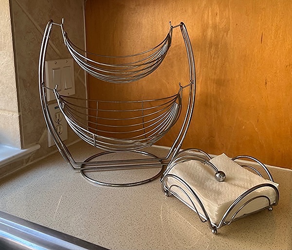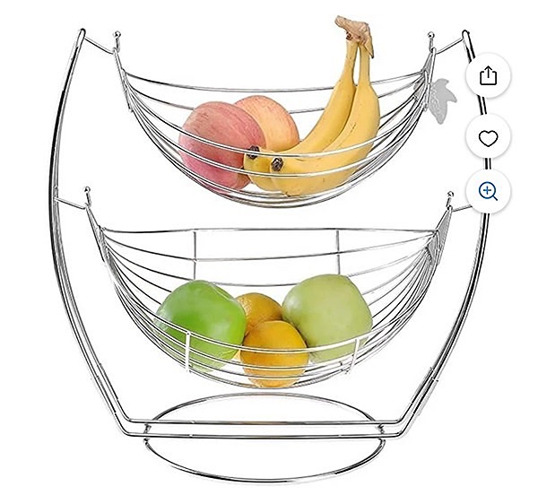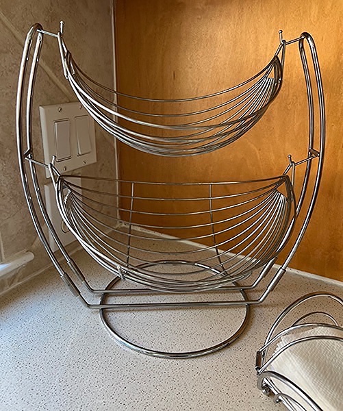 "Double design to artfully display your fresh produce. Chrome metal construction for durability and style. Provides unparalleled air circulation to your fruits and vegetables to keep them fresher longer"…$40, total, firm