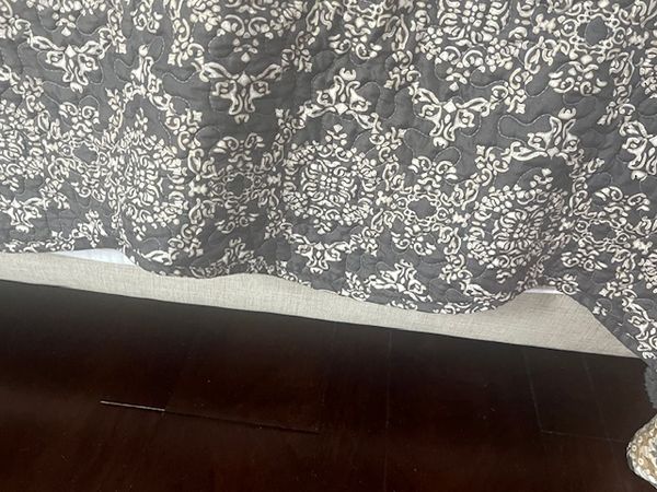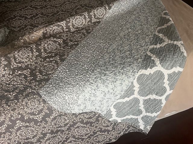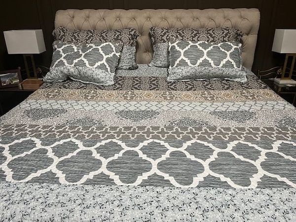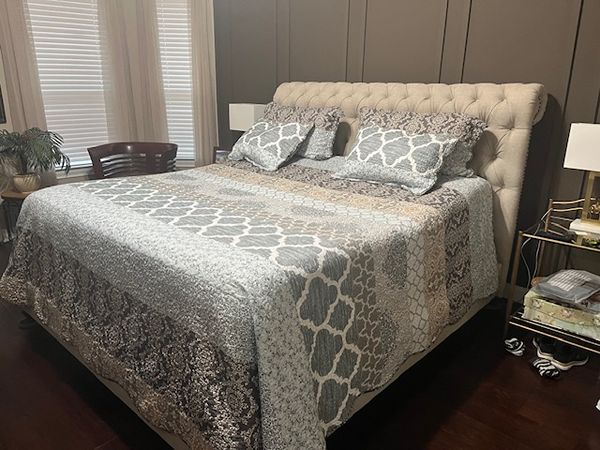 Reversible, oversized, quilted King bedspread with scalloped edges. Includes 4 pillow shams. Excellent condition. No smoking home and no pets.