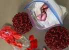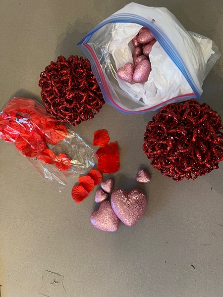 Ready for Valentine’s Day!! Decorative red & musical black/white bows with beaded hearts to hang on back of chairs. Heart tree 12” x 12”pic, 6 melamine appetizer heart plates, two 7” diameter glitter balls, rose petals & lilac little hearts.