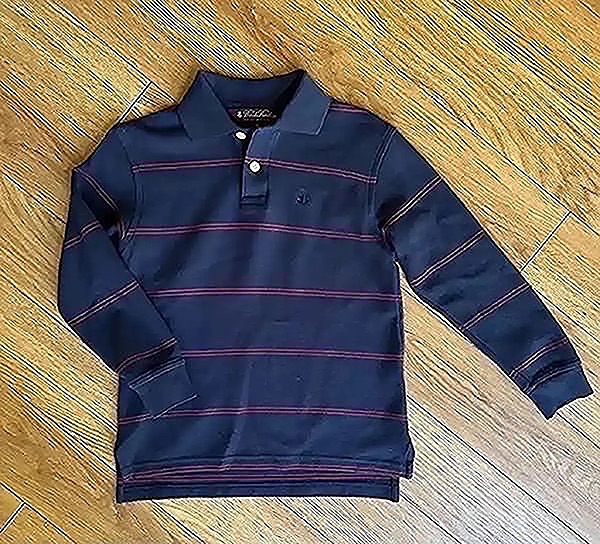 Size XS (4-6 yrs), dark blue with red stripes, 100% cotton, great shape!