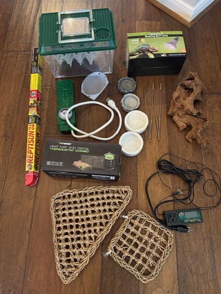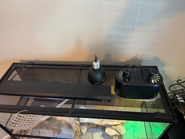 We had this setup for a bearded dragon. Everything you need is included, except for a stand. Cash only, pick up in Alden Bridge. This is perfect for lizards, snakes, frogs, turtles, etc. Here's everything that is included: