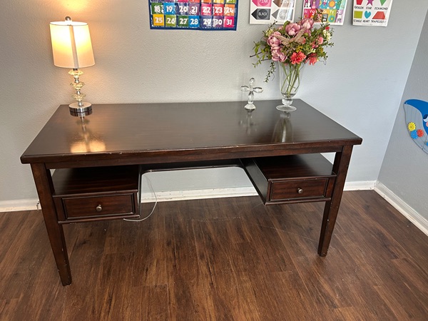 Solid wood desk! Is heavy so you will need help when picking up! Fully fictional drawers! Measurements are length 60 inches width 28 height 30