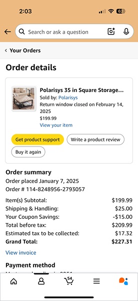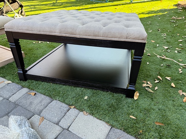 35 inch, square coffee table. Black wood and gray upholstery. Good condition, used for less than six months
