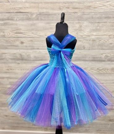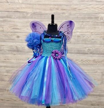 Turquoise Royal Blue Purple Peacock Fairy Princess Birthday Costume w/Crown Wand Fairy Wings - Full 3 Layer Tulle Tutu Skirt