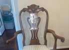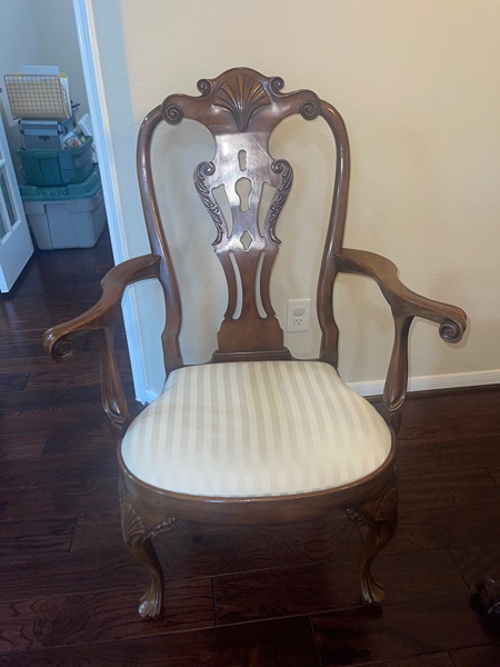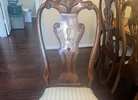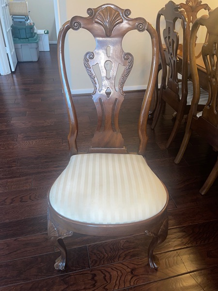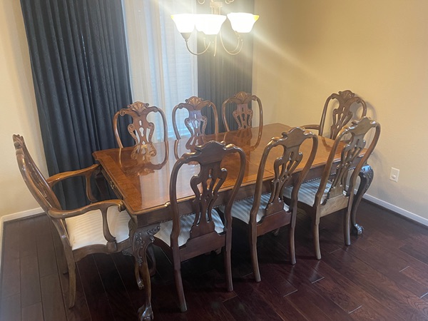 76 inches long and 46" wide. Includes (2) 24" extension pieces taking table to potentially 124" (10'4"). Eight chairs total with 2 captain chairs with arms.