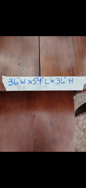 High top wood dining table with pop up leaf and 8 chairs. 54" square with leaf open.