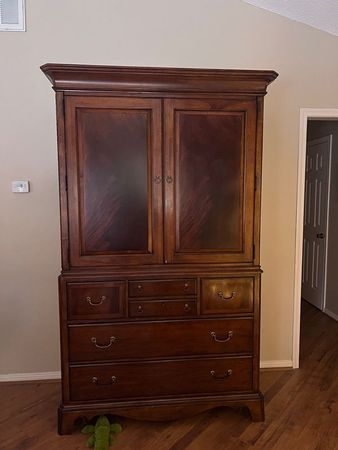 Large cherry wood armoire mainly used to hold blankets and dishes. Great condition and polished usually every other weekend. This armoire has 8 drawer's total - 6 with decorative handle and 2 inside doors.