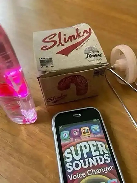 Includes a Slinky, voice changer, and other toys.