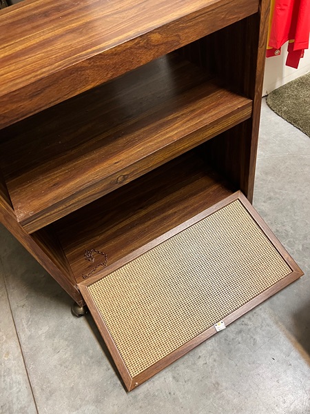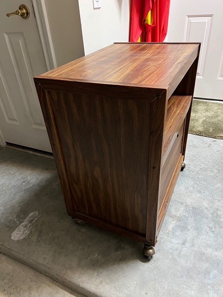 Wooden, rolling utility cart with cabinet. Nice paneled side that you may be able to reverse. Just needs a wipe down…$40 firm