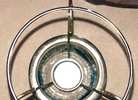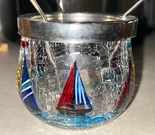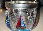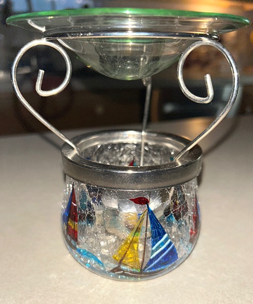3-piece glass and metal set featuring a crackle glass sailboat bottom, a metal stand that holds a tea light candle, and a glass dish on top to hold wax melts or fragrance oils. This was only ever displayed for decorative purposes, never actually used. There's a small scratch on the glass top piece (pictured) but it shows more in the picture than in real life because it caught the flash from the camera. Stands about 5.5 inches tall when fully assembled. Smoke free home. $8