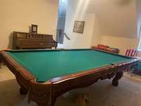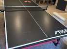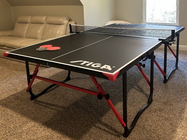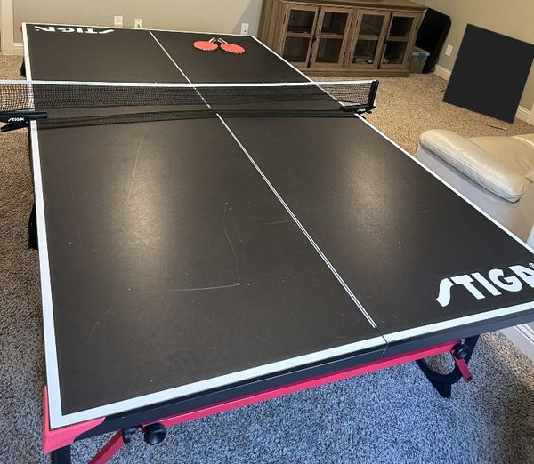 We are selling our Stiga VOLT Ping Pong Table, including an upgraded net, paddles, and balls.  There are some scratches on table surface and one side is not perfectly flat (although you may be able to adjust and make it flat using the tensioning system - the red bars and knobs underneath the table).  Unlike most full size ping pong tables, each side of this full size (regulation size) table folds flat requiring less storage space.  This table has been kept inside since we purchased it new from Academy.  Academy currently sells this same table (table and basic net only) for $299.