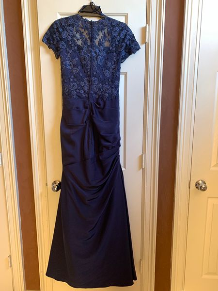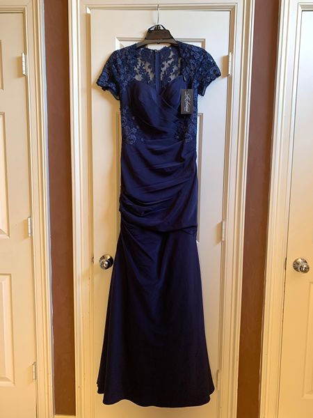 Brand new Mother of the Bride dress by La Femme.  Style # 27989 in navy blue satin material with lace.Very stylish and elegant.