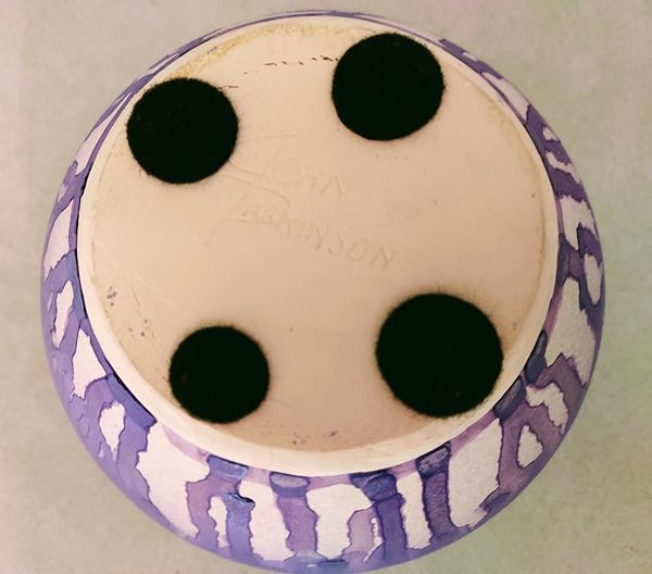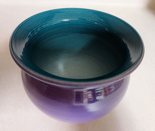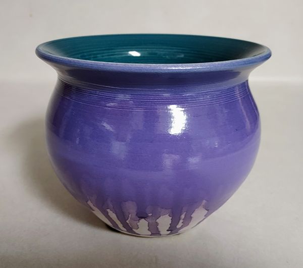 This turquoise and purple pottery pot is signed by the artisan, John Parkinson, on the underside. It measure aprox. 5" in diameter at the opening and aprox. 5" tall. It is in excellent condition without any stains, chips, cracks, crazing, etc. This one-of-a-kind pot be used as a small container compliment a small planter of African violets or mini roses, a holder for candles or just a unique piece of art to display. Price is $25 - cash only. If interested text or call 281-825-9606. Thank you.