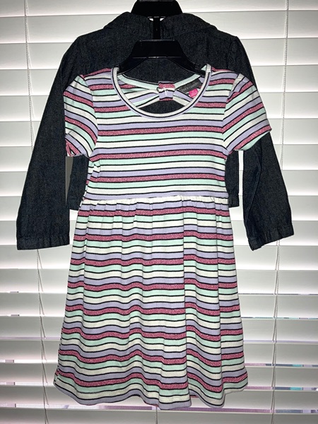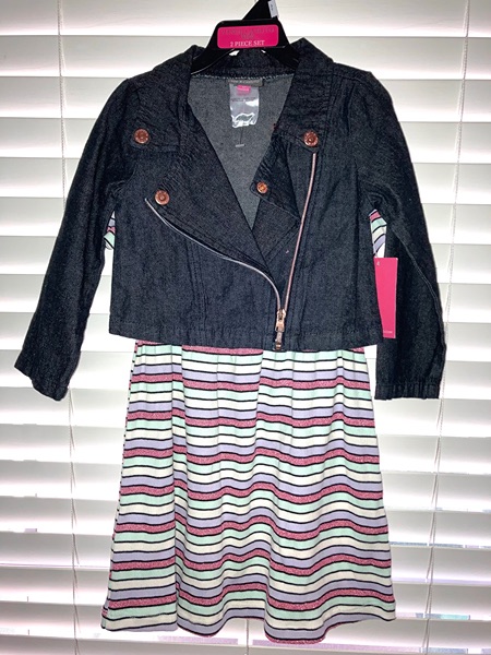 Vince Camuto brand dress, size 3T. Horizontal sparkly striped short sleeve dress with coordinating jean jacket. New with tags from smoke free home. $15