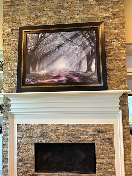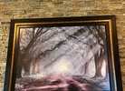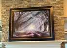 LARGE LANDSCAPE PICTURE THAT ENHANCES ANY FIREPLACE OR WALL IN YOUR HOME. THE FRAME IS A DARK WOOD WITH A SMALLER GOLD INSET ON IT. THE PICTURE IS A TREE LINED ROAD WITH THE SUN SHINING THROUGH. THE FRAME AND PICTURE HAVE NO DEFECTS OR MARKS ON IT. EXCELLENT CONDITION. ORIG PRICE....$ 150. CASH ONLY. THE DIMENSIONS ARE 60" WIDE AND 47" HIGH.