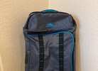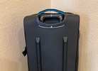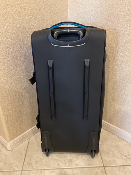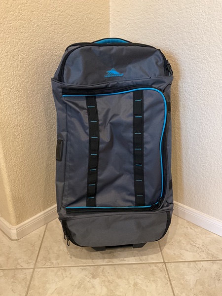 High Sierra Large Wheeled Duffel Bag - Telescoping pull handle, smooth recessed wheels, Compression straps, soft sided, Easy Access, Multiple Compartments inside and out. Grey and black, with blue accents. Dimensions: 14" x 30" x 12"